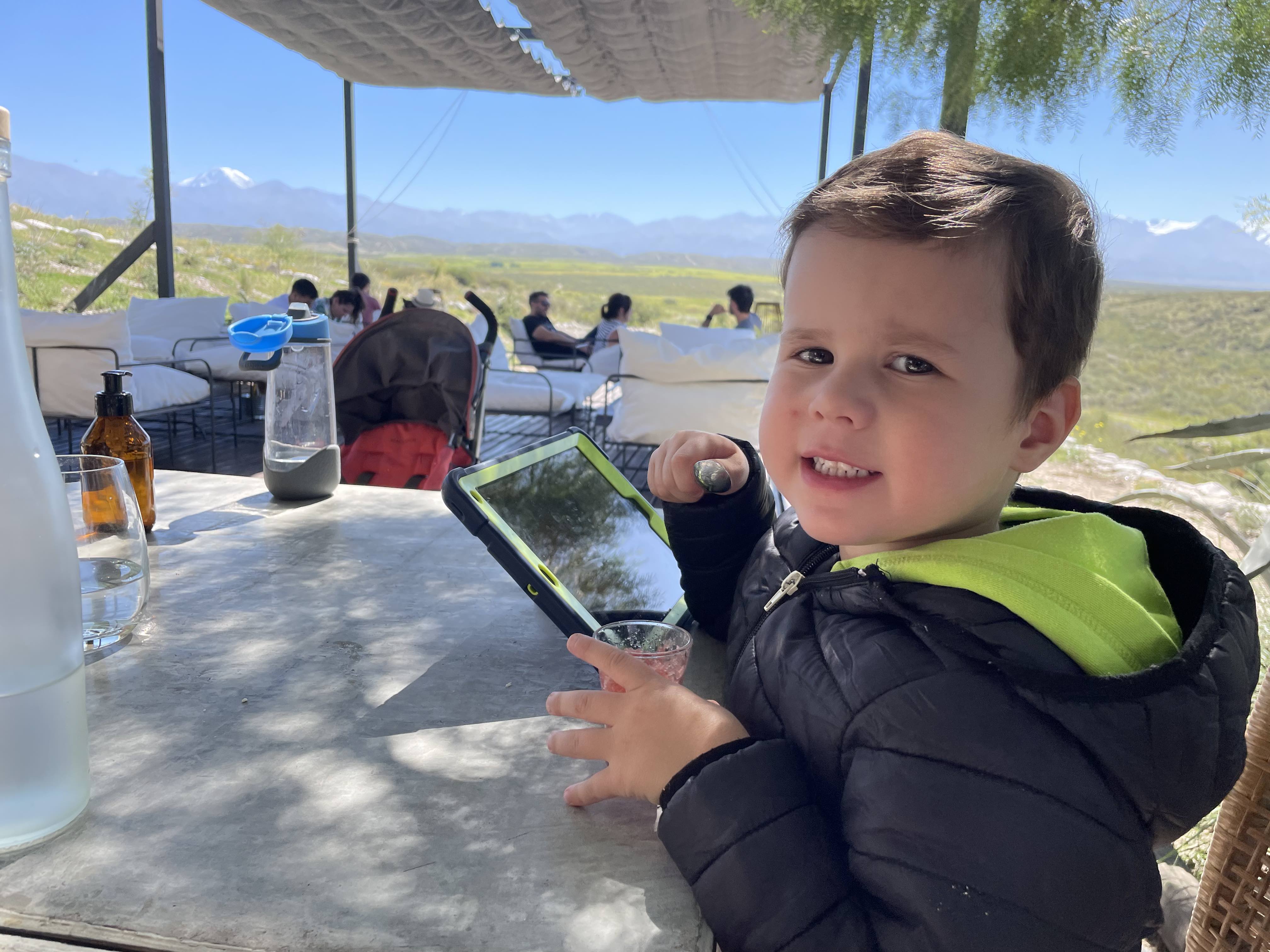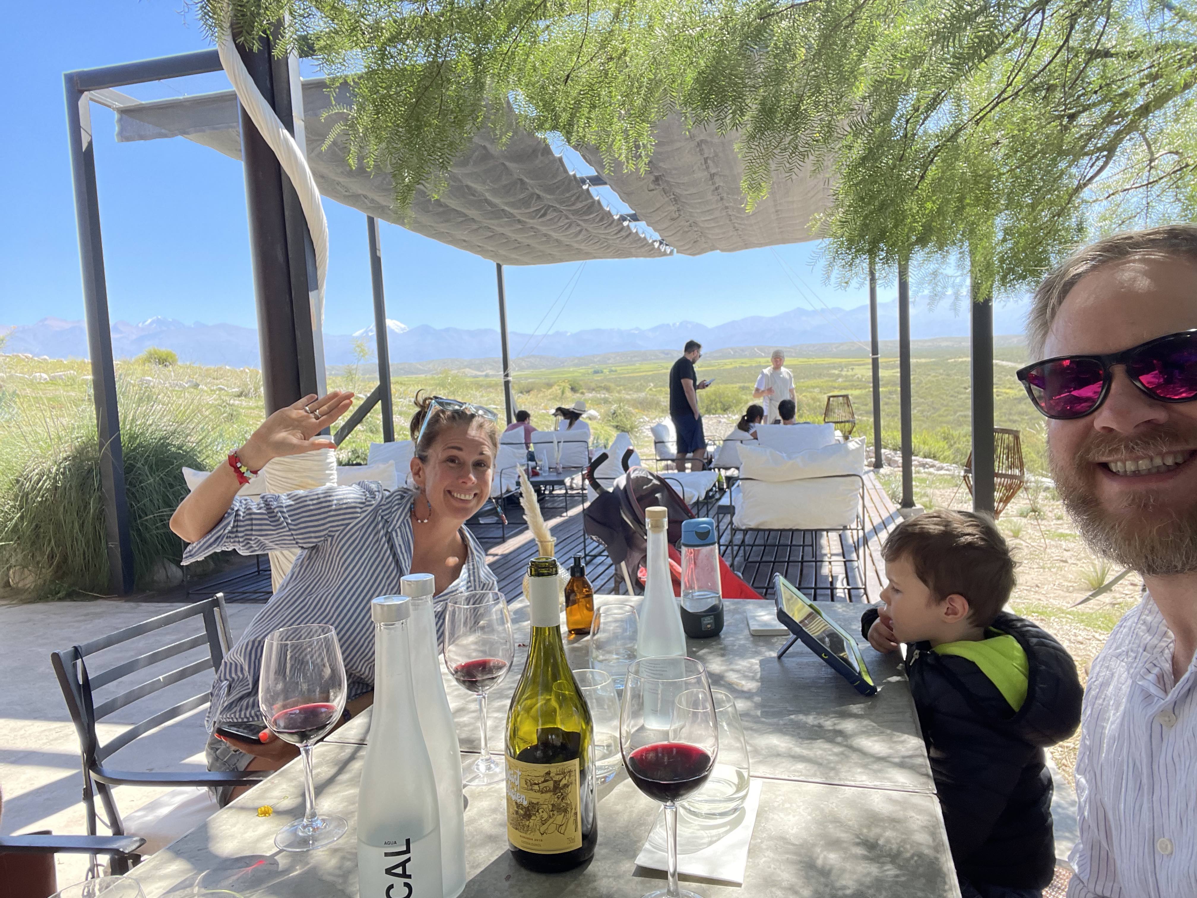 We’re in Menzoda at the foot of the Andes mountains, in wine country. This is the land of Malbec, other countries may claim that they have Malbec – they may be able to grow the grape, but this is the only place where the wine has soul. We flew out of BA on Sunday morning and are meeting up with the newlyweds later in the day – they left yesterday afternoon and are taking the scenic route driving 12hrs cross-country. We’re kind of crashing thier luna miel. Agus has a secret itinerary, all I know is that local tour organiser Vale (a friend of our friends) has organised everything for us. We are staying the first 3 nights in Valle de Uco, but our first stop is Alta Vista for lunch. Aflie was very good on the 1.5hr plane trip, but needs to stretch his legs…the transit in the airports plus the car rides are now taking the toll on him. I’m glad to see that can run around under the trees on the large grassy area at the winery. He runs straight inside to use the toilet – bien Alfie! Later on he announces to Agus that he needs to go to the toilet again and starts taking his pants off…Agus asks if he needs to do a “bush wee” to which he answers “no, I’m going to poo” – she grabs him and rushes inside. Lunch is great, the wine is good, Alfie is watching iPad at the table and is quiet so I don’t care – I’m in Mendoza looking at the Andes. La vida es buena.