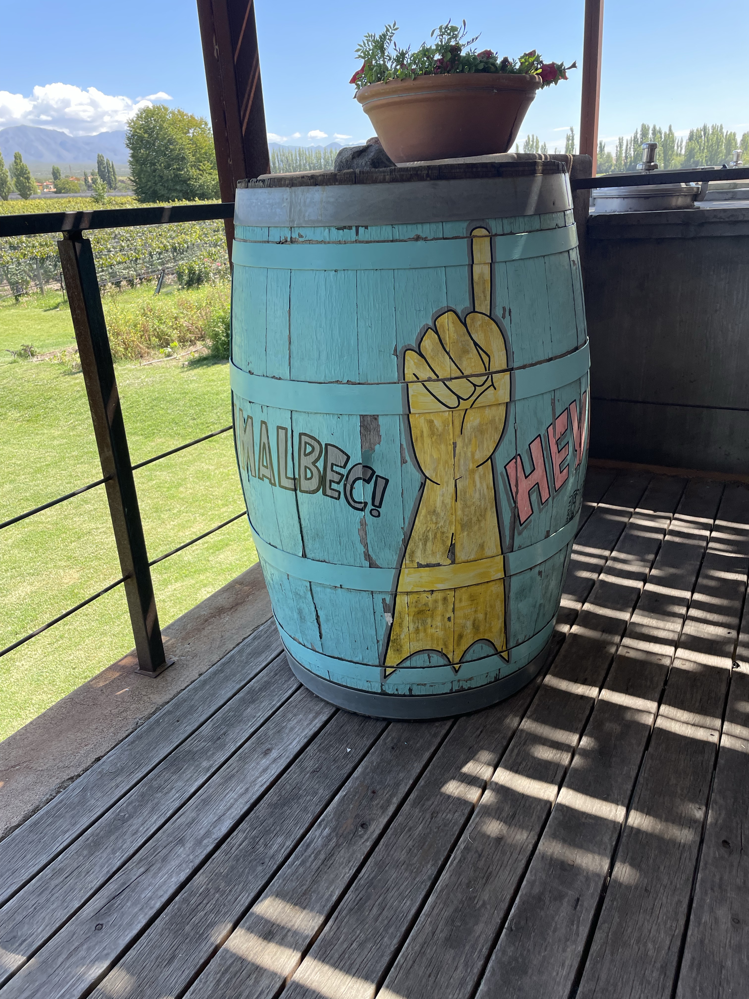 We’re now off to the first winery of the day, Riccitelli. They are a smaller, more boutique bodega that has been around for a long time and I’m told they were one of the major promoters of Argentinian Malbec internationally. Their winemaking techniques were interesting to me as I’d not before seen Spanish and Italian style small terracotta fermentation urns used. They also had 2 different types of concrete eggs (shape and size varied) as well as above ground and subterranean concrete tanks as well as oak barrels. On to the tasting – they started us off with a Torrontés. It’s a popular white wine here and almost all grown up north in Salta not in Mendoza. I don’t mind Torrontés and this wine was ok, but I was here to taste wines from Mendoza. Next was their house wine Malbec blend – things were looking up. The Cab. Fanc. was good, different to those from Uco, it has more spice and less fruit upfront. Then the Republic Malbec with grapes from vines planted in 1908, fermented in French oak and only 6000 bottles produced annually – it’s their flagship wine. It’s a very good Malbec, up there with some of the best I’ve had this trip.