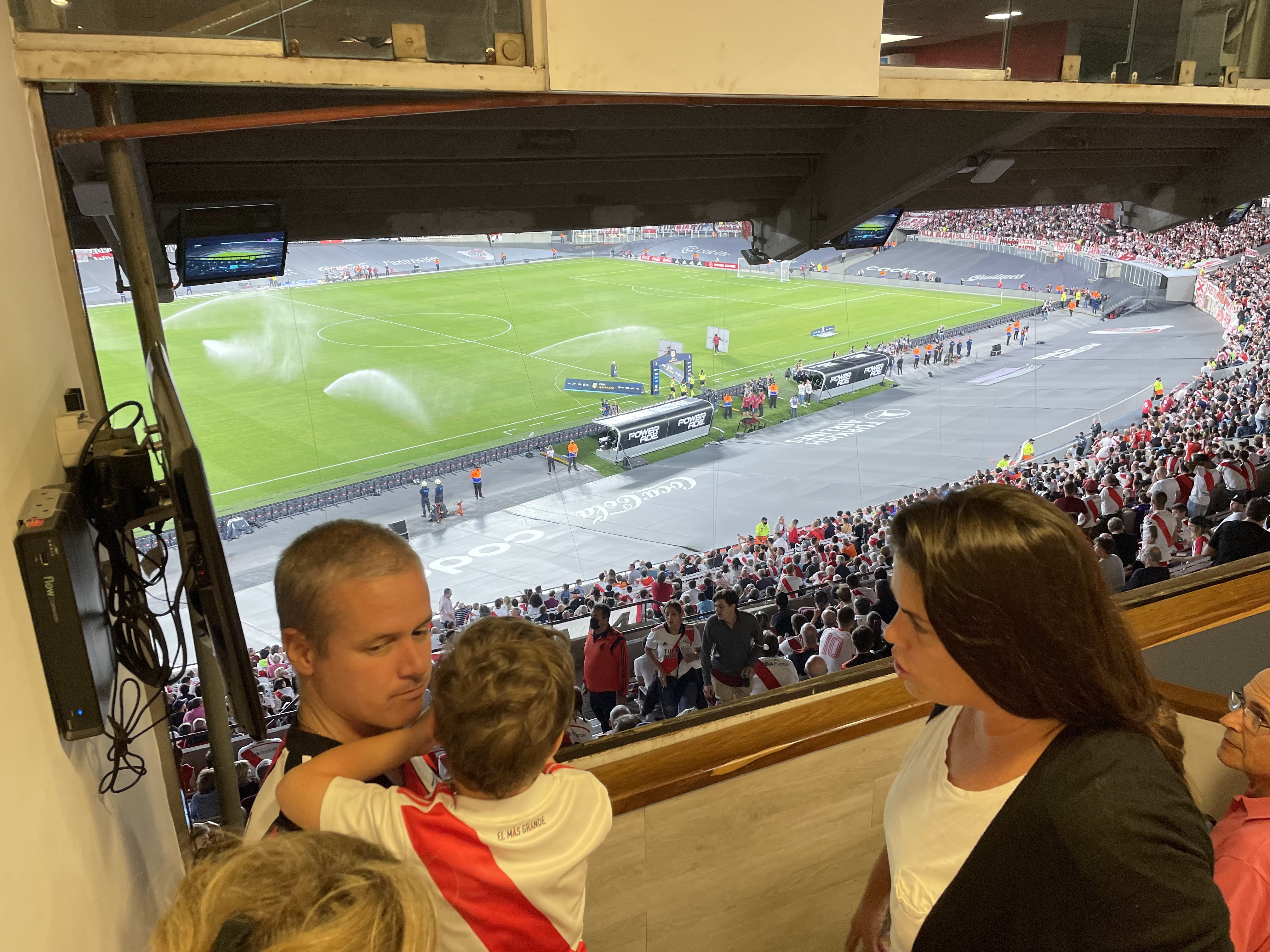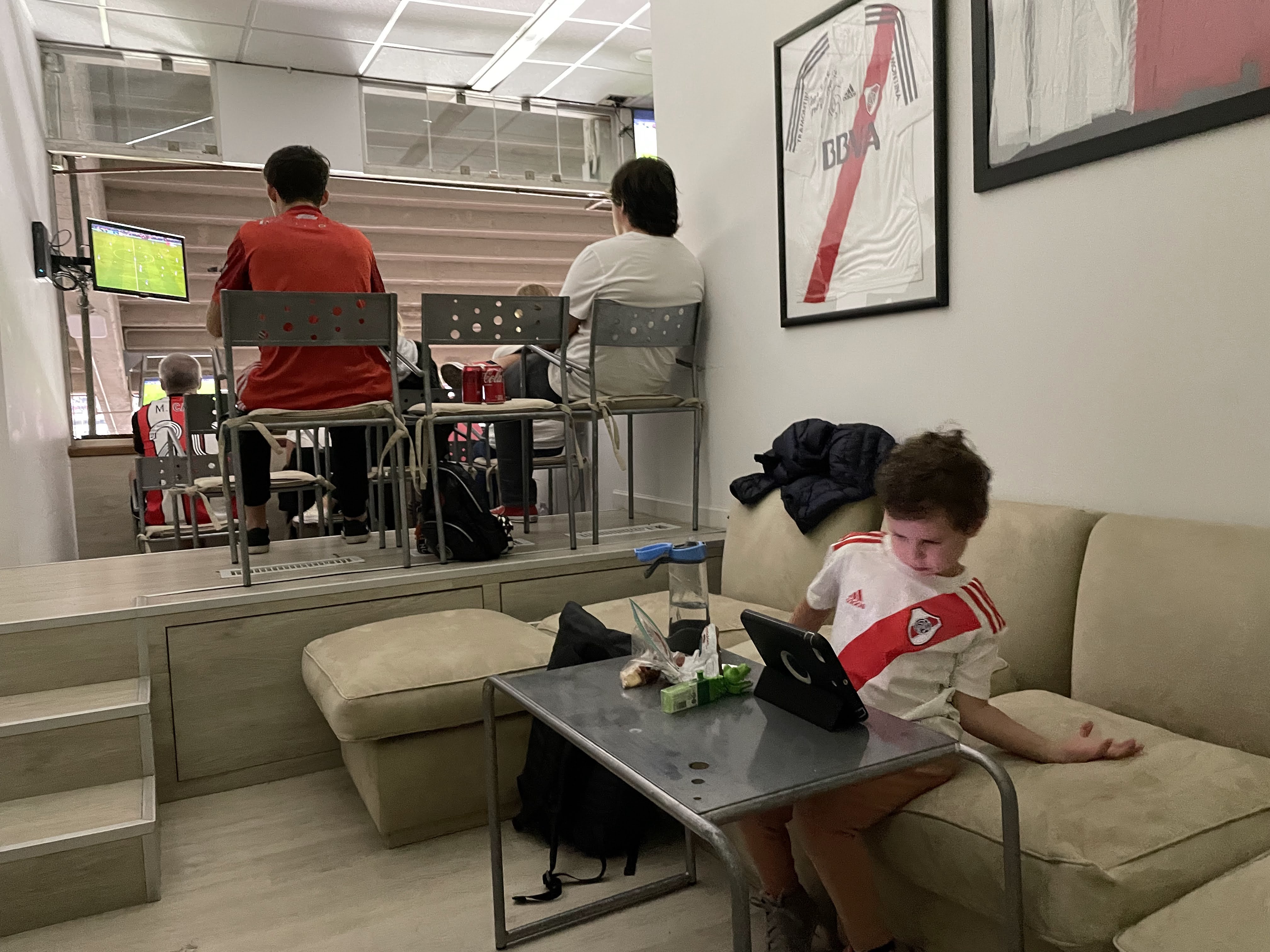 We have an amazing view of the ground and from here I can see the renovation work that has been done to the pitch during COVID lockdown. It’s not obvious on TV but the pitch has been dropped down 2m to allow a new watering & drainage system to be installed to ensure that the grass surface is one of if not the best in Argentina. I’m told that renovation works are still happening to the stadium and won’t be finished for likely another year. Santi takes Alfie to sit with him in the first row of seating and I sit behind them with Caro in the 2nd of the 3 rows. We don’t have to wait long for the players to come out onto the pitch and for the match to start and the first goal to be scored. 6 minutes in River scores and the crowd goes nuts…I’m not sure that Alfie was expecting all that noise, but he cheers along with Santi. The second River goal comes 3 minutes later and Alfie definitely was not expecting that one and the response to it from the people in our box – I think the screaming actually scared him a bit. I had to take him to the couches in the back of the palco to give him some snacks and setup the iPad. This is where he stayed for the rest of the match, except for when River scored 2 more goals and he ran up to join in the celebrations.