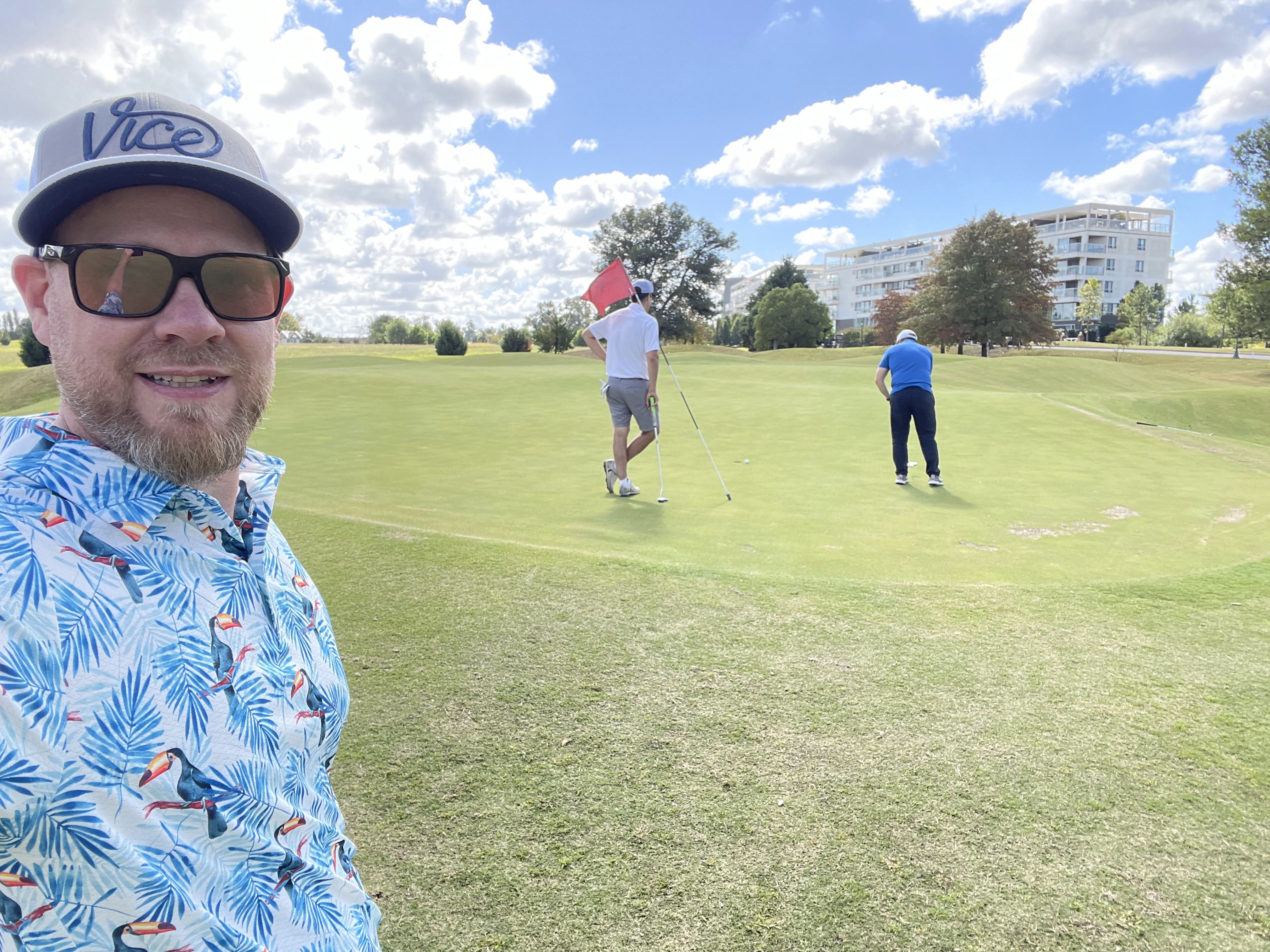 I was up early on Saturday morning as I had another round of golf booked. It was fresh with a fog and frost but I put my trust in the weatherman that it would warm up and be a sunny day. This time I ended up playing with a couple of guys my age, one of them had just flown in from Chile for the Easter holiday. I was told that there was nobody in the group using a cart so I chose to walk and carry my clubs. These guys turned up to the first tee with a cart…and we were a threesome so I played catchup all day. I had a pretty decent round and didn’t loose as many balls as yesterday. I had another couple of notable shots though during the round – I sunk my 4th for birdie on the 2nd from the green-side bunker, I chipped in twice from the fringe (once for par and the other for birdie) and I strung back to back birdies together on 16 and 17.